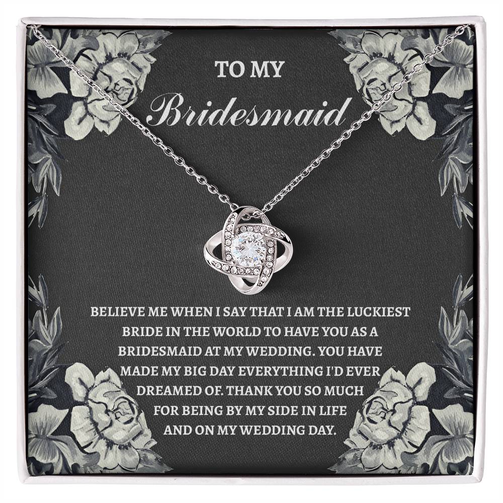 When your bridesmaid receives this Love Knot Necklace, she will feel truly appreciated and loved. The heartfelt message will express your gratitude and the special role she plays in your life, making her feel cherished and valued. This elegant gift will be a lasting reminder of the important part she played on your special day, reinforcing the strong bond of friendship you share.